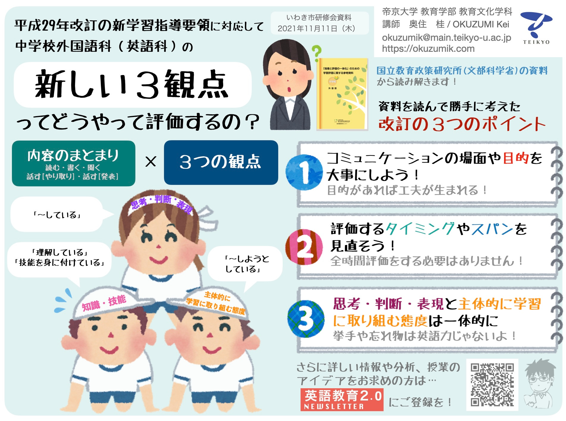 新観点の評価についてお話をしましたが、超短時間でしたし、会場の様子はあまりわからないので、ご期待に応えるお話ができたのかは不安です。セッティングしてくださった先生からは「よかった」と言っていただけたのでホッとしていますが、この激動の時期に研修をセッティングする先生方も本当にお疲れさまです、と頭が下がる思いです。