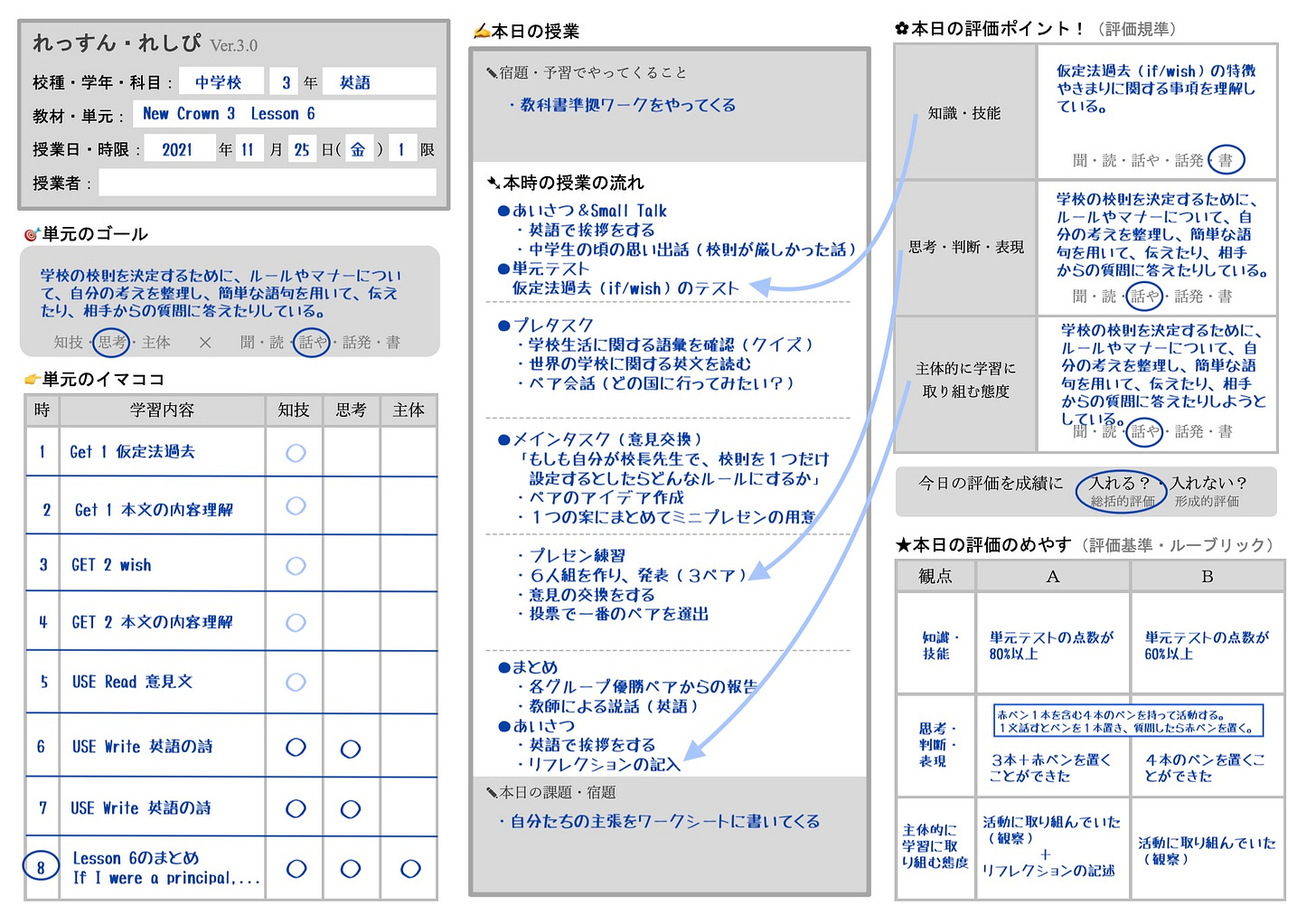 さて、私の教科教育法の授業では、あまり学習指導案を書きません。代わりに、「れっすん・れしぴ」というA4版一枚に授業デザインの大事なところだけをまとめたものを作ってもらっています。この「れっすん・れしぴ」は私が中学校教諭の頃、年次研修でお世話になった教育センターのO西先生がご紹介してくださったもので、以来私は授業をデザインする際に愛用してきましたし、今は私なりにアレンジして(新学習指導要領にも対応した形で)使っています。